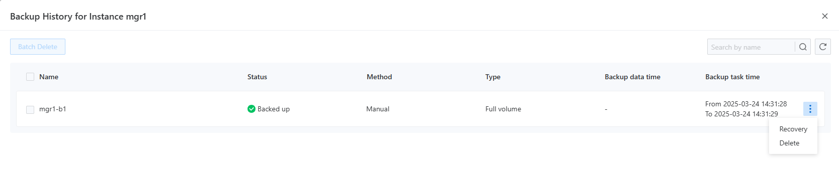 By selecting the History function from the right-side menu of the specified instance, users will see a pop-up menu displaying all backup records for that instance, as shown in the following image.